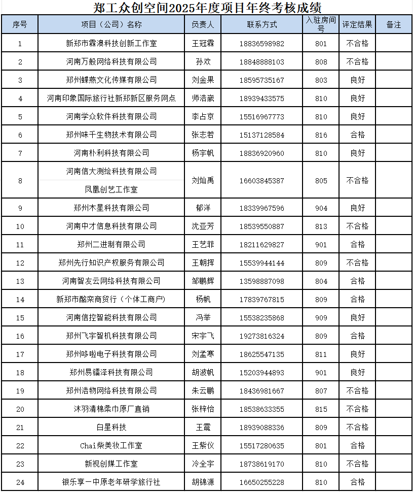 根据《郑州工业应用技术学院大学生众创空间管理办法(2024年修订)》有关规定,2025年12月29 日,学校邀请专家对众创空间入驻项目进行了期末年终考核,现将结果公示如下: